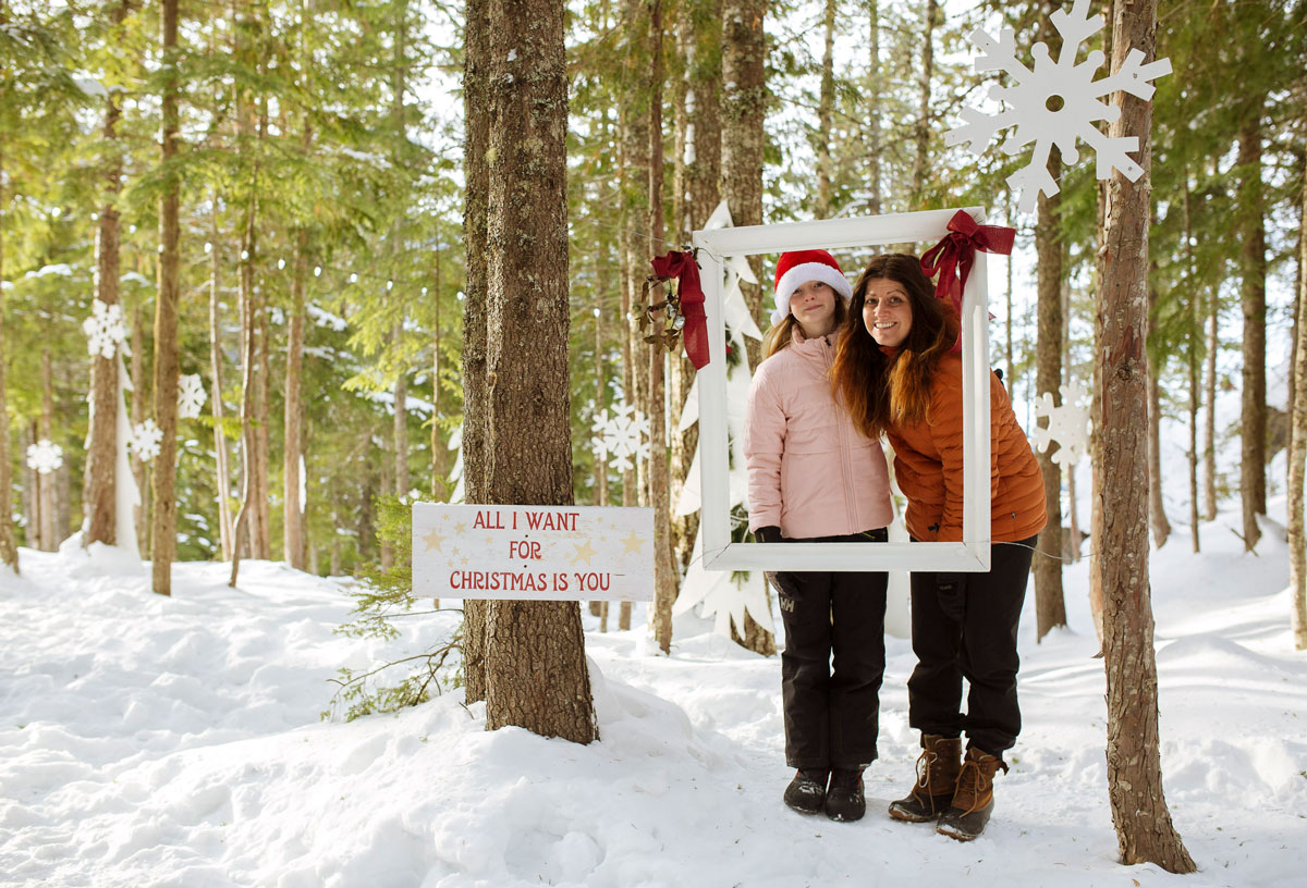 Photo: A mom and daughter posing in a festive frame in the snowy forest at the Sea to Sky Gondola.