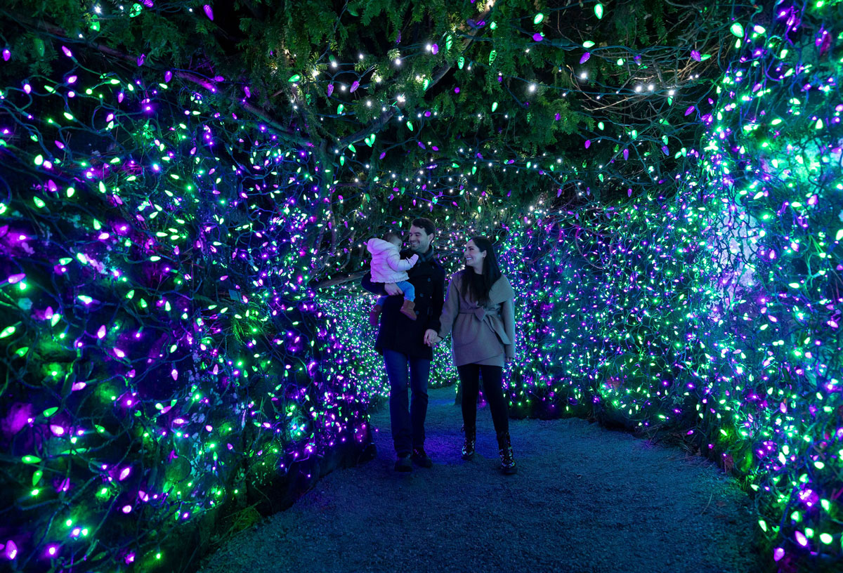Photo: A family walking through a vibrant light tunnel at VanDusen Botanical Garden's Festival of Lights.