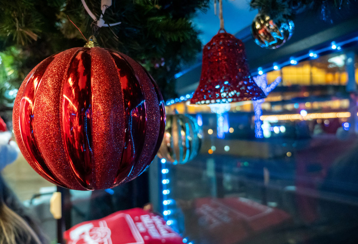 Photo: Festive red ornaments hanging in a Big Bus with city lights in the background.